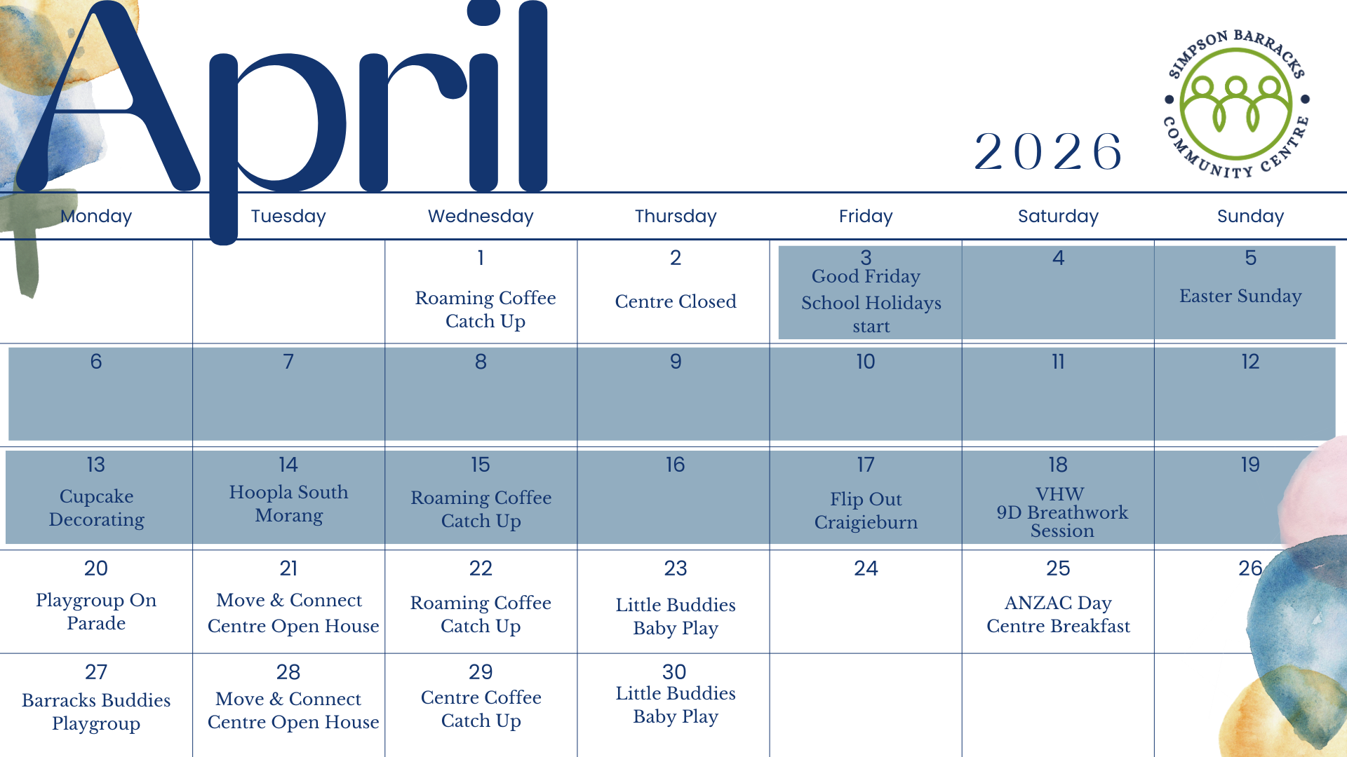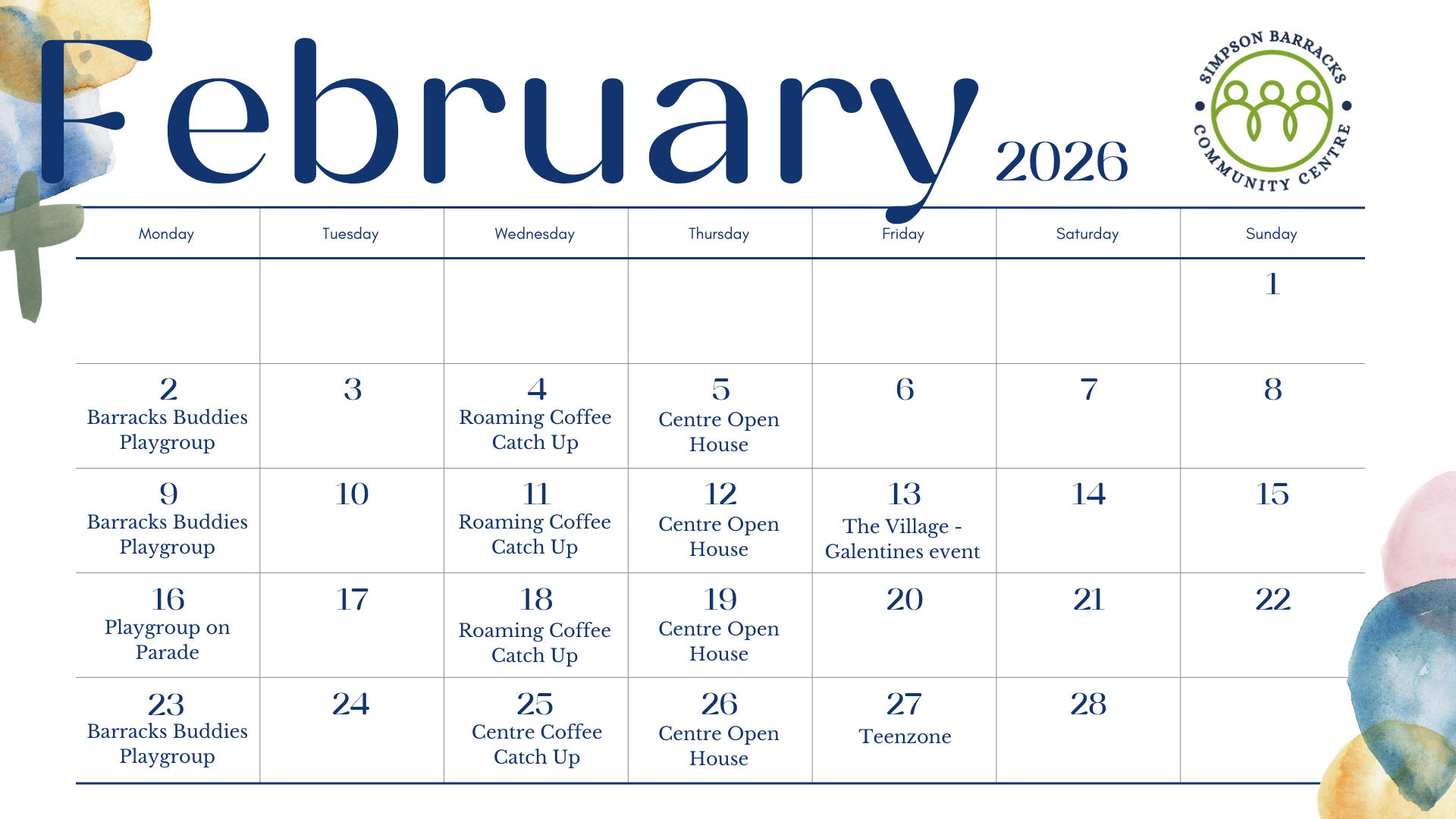 Simpson Barracks Community Centre (SBCC) is a not-for-profit organisation, established for the support of individuals, partners and families living a Defence lifestyle, by offering the development of support networks, friendships, and sharing of knowledge.